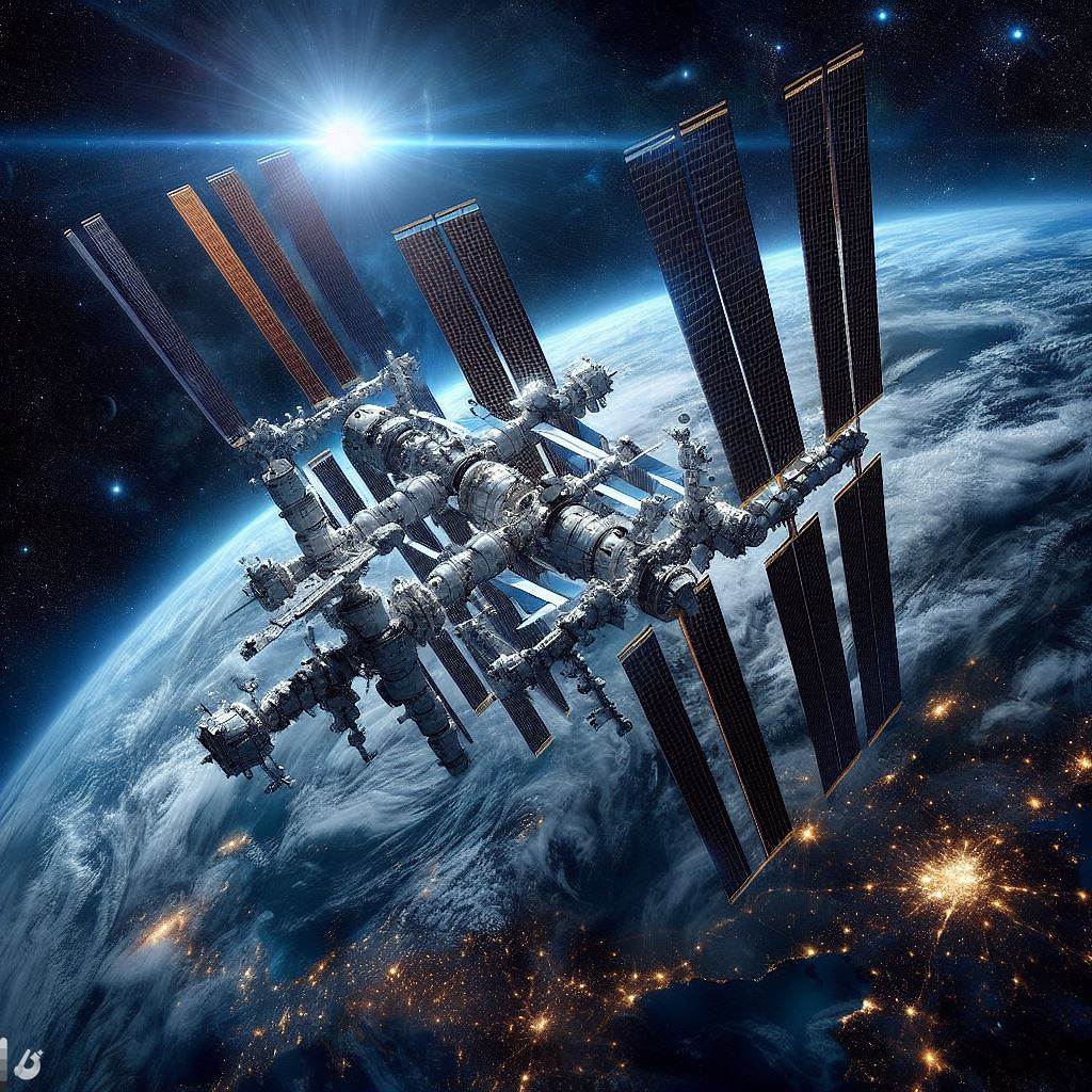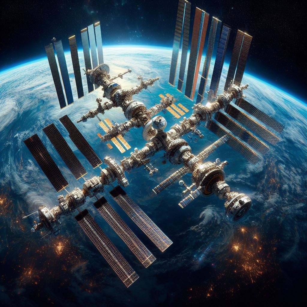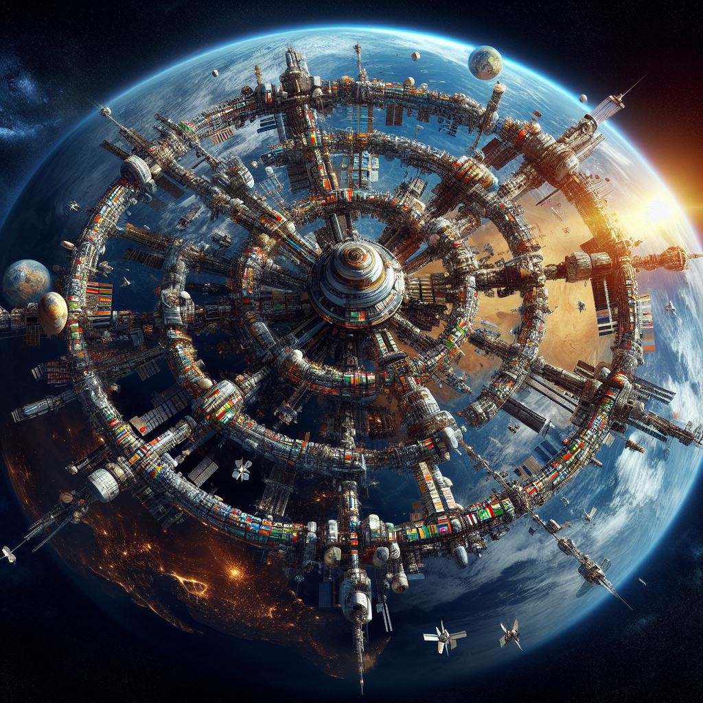 Промт:  "Фотография, Орбита Земли, Могучий орбитальный комплекс Международной Космической Станции следующего поколения с секторами всех стран входящих в совбез ООН"