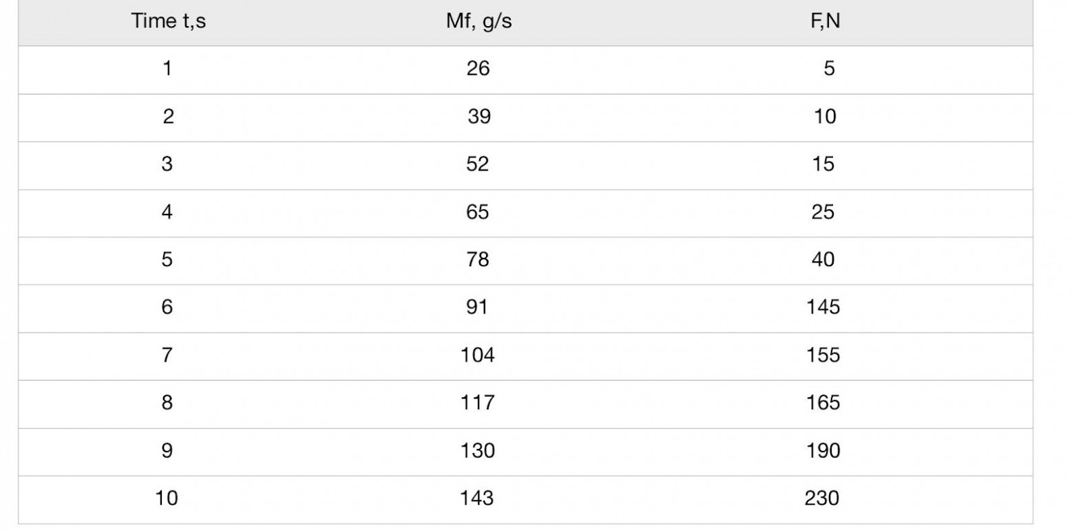 Массовый расход мерил, вот таблица для первого варианта двигателя, где регистрировался скачок тяги. Напомню, что в следующих двх версиях автор изменил расположение форсунок, и скачка уже не было, все работало ровно от 0 до 100%, что само по себе уже интересно.