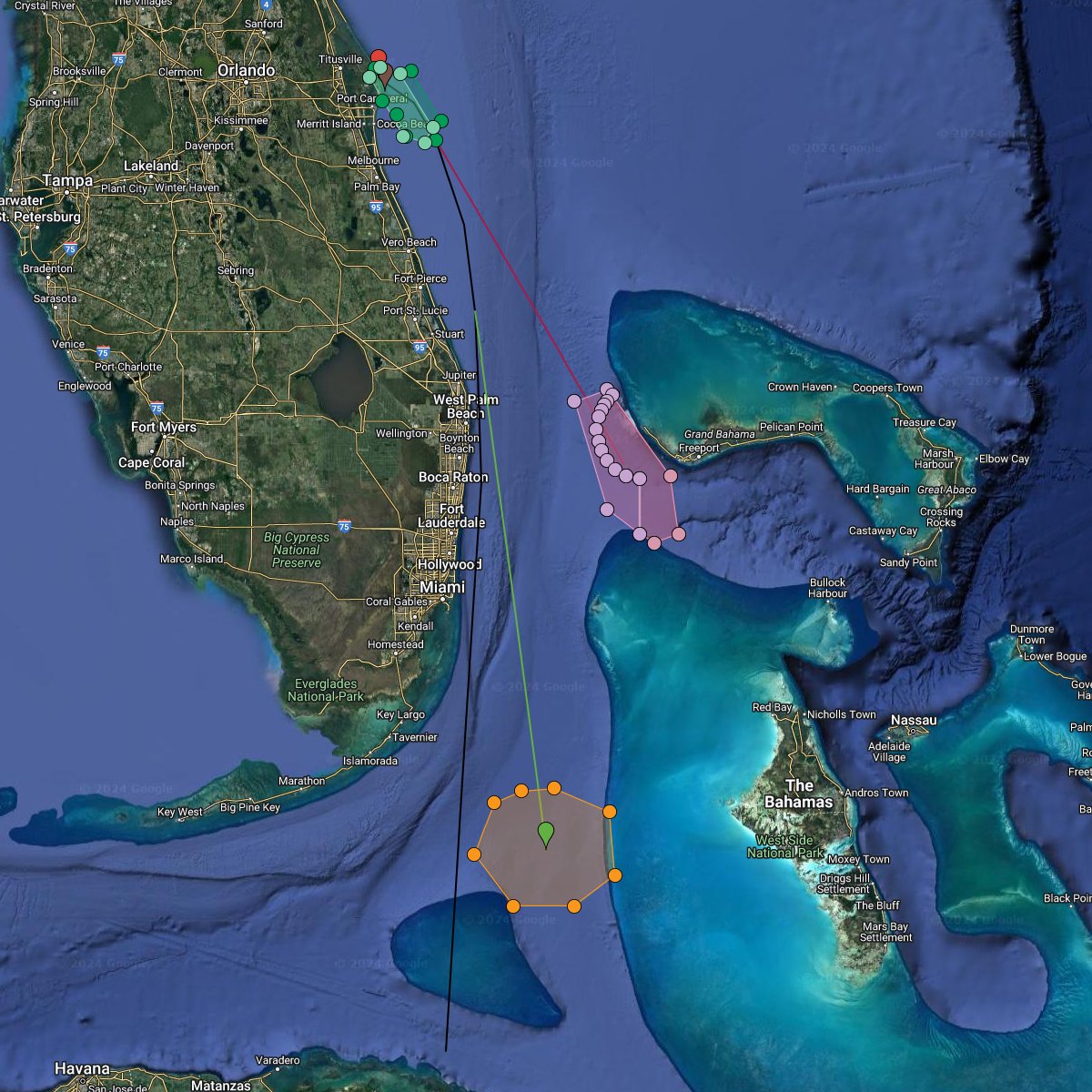 Launch Hazard Areas for #PACE mission from SLC-40 NET 06 Feb 06:33 UTC, alternatively 07-12 Feb. LZ1 landing for B1081.4. Drop areas in case of stage2/boostback failure. Fairing recovery ~475km downrange. Stage2 debris reentry in East Pacific. https://bit.ly/LHA-33