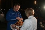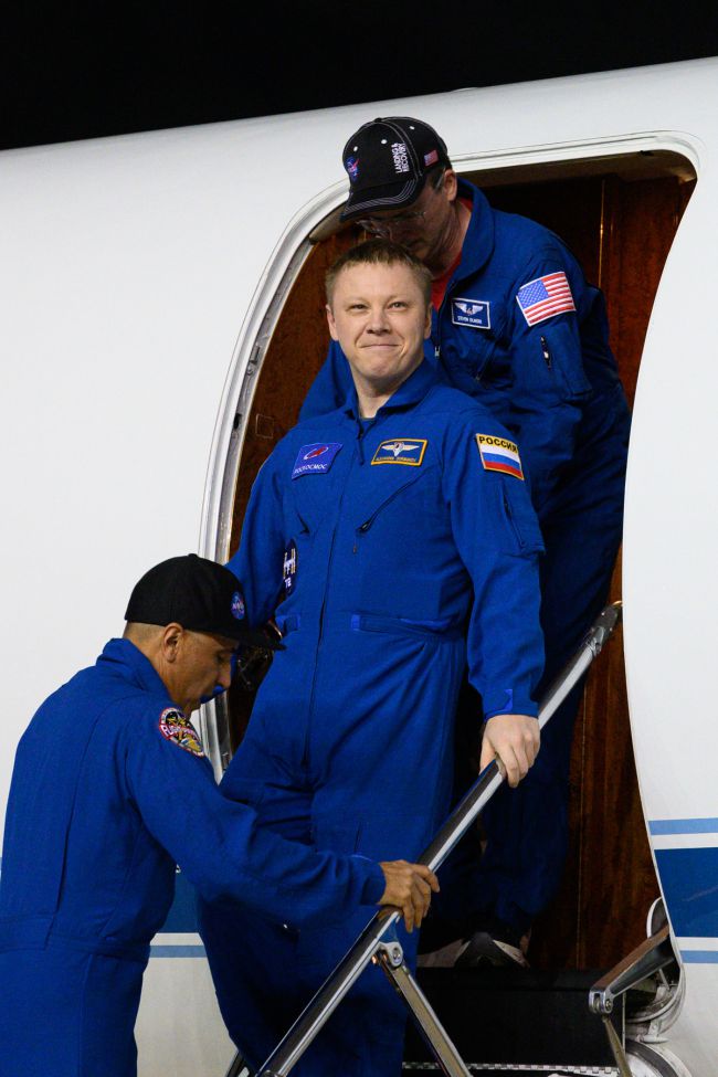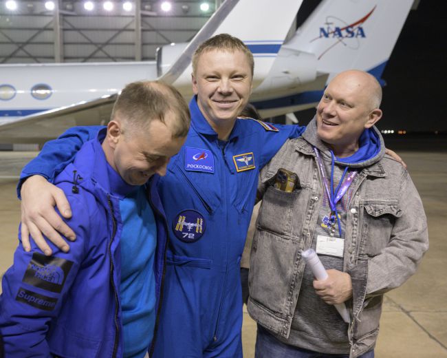 Александр Горбунов провёл на орбите 171 сутки. У трапа самолёта его приветствовали коллеги, космонавты Олег Платонов и Олег Артемьев.