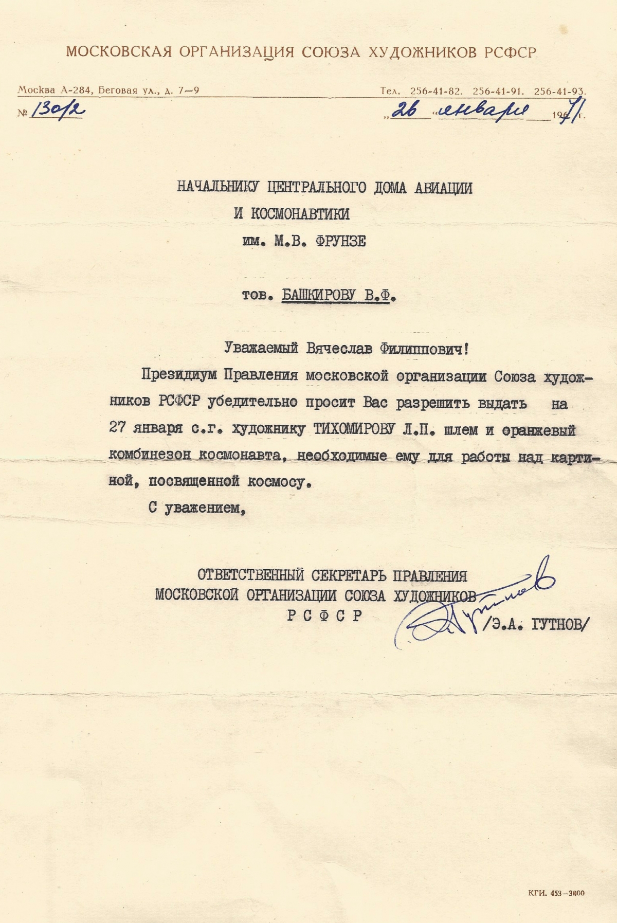 «Последняя картина Тихомировых – Во имя человечества. Этот многолетний труд – гимн первооткрывателям космоса, утверждающий нравственный идеал современника, величие достижений людей нашей эпохи. Картина строга и символична. Выдающийся советский ученый С. Королев открывает окно в безбрежный неизведанный мир космоса. Центральная фигура полотна – Ю. Гагарин, с вымпелом Советского Союза в руке. Выразителен и глубок образ третьего героя картины – В. Комарова.»