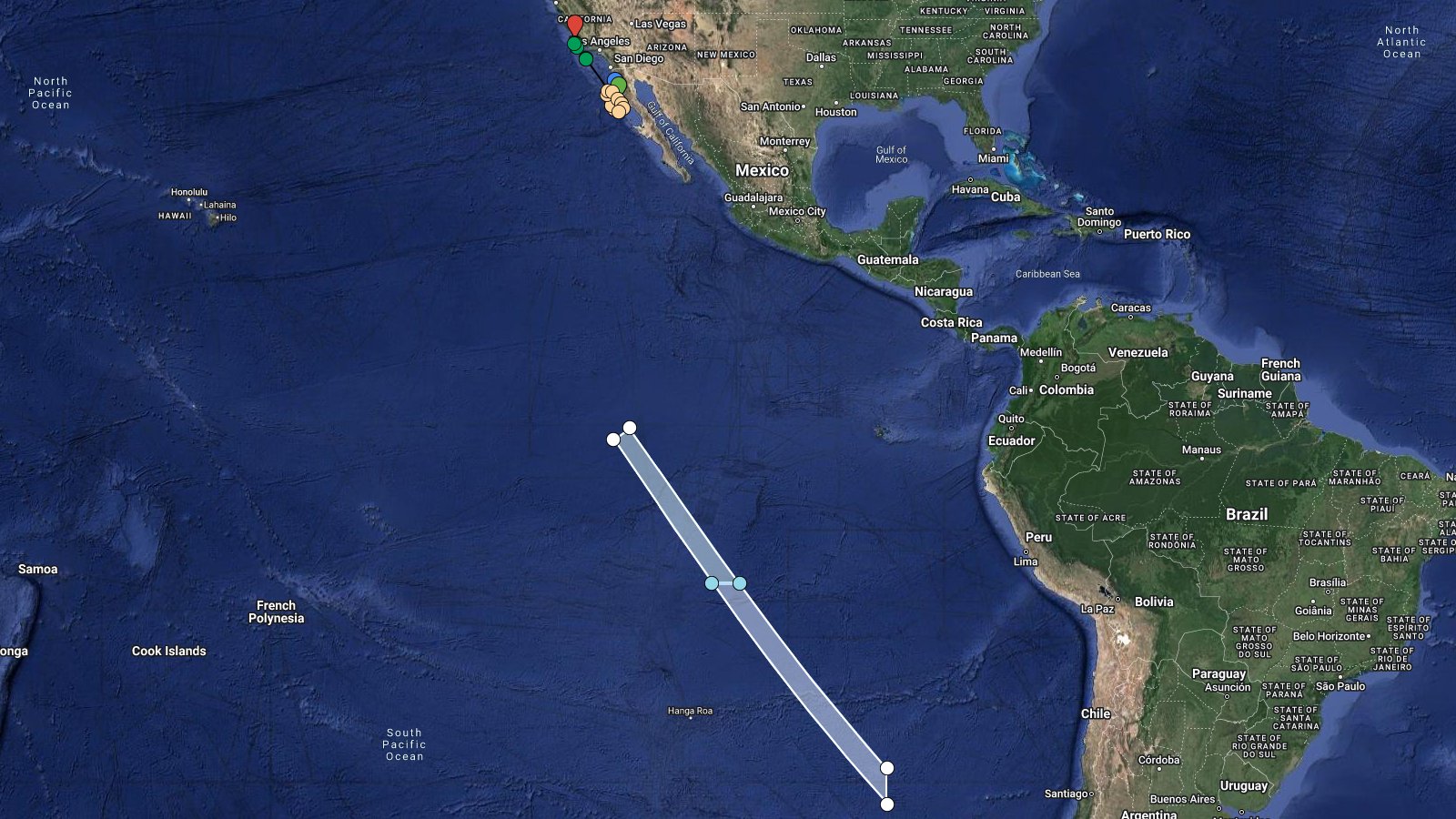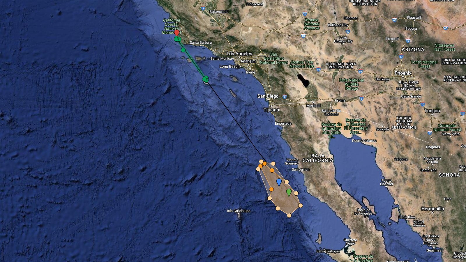 LHA map for #Starlink Group 7-15 from VSFB SLC-4E NET 23 Feb ~04:11 UTC, alternatively 24 to 28 Feb based on issued NOTAM/NOTMARs. Planned B1061.19 recovery ~642km with estimated fairing recovery ~693km downrange. Stage2 debris reentry in East Pacific. https://bit.ly/LHA-33