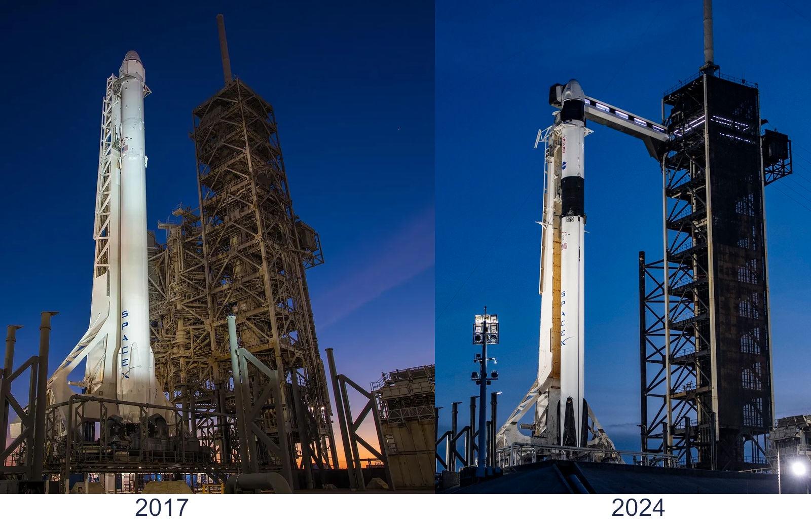 Источники: https://www.nasa.gov/image-article/falcon-9-rocket-with-dragon-spacecraft-vertical-launch-complex-39a/ (2017) и https://blogs.nasa.gov/crew-8/2024/03/02/nasas-spacex-crew-8-mission-coverage-is-underway/ (2024)