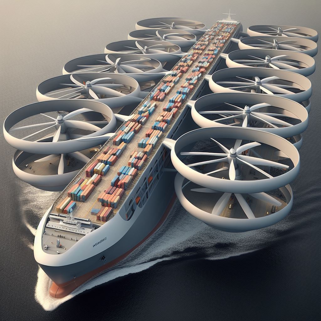 Нарисовать картинку ОЧЕНЬ огромного грузового мультикоптера на ядерной тяге с 500 винтами, способного перевозить 100 грузовых контейнеров общим весом 2000 тонн. Он должен выглядеть как пассажирский корабль с винтами вдоль бортов. Форма и размер - вытянутый прямоугольник размером с корабль-контейнеровоз. Похож на проект атомного вертолёта - но с 500 винтами каждый диаметром 10 метров.