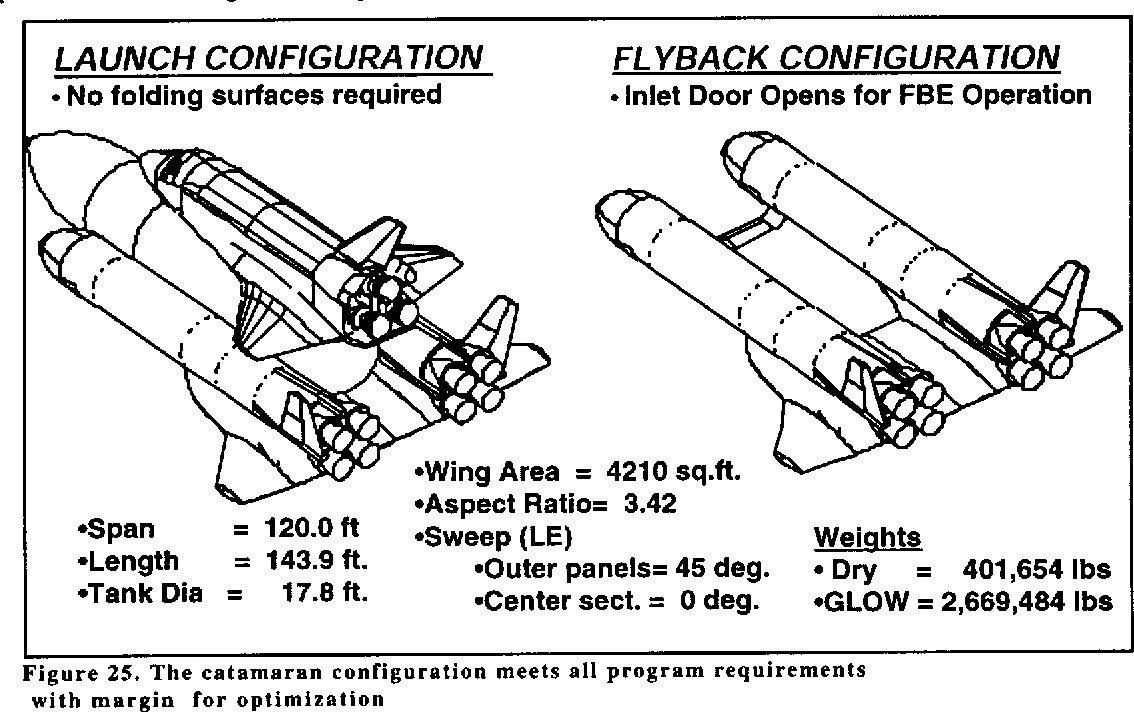 Если приделывать крылья к ракетам я бы прям как на картинке сделал бы катамаран и не парился, в среднюю секцию керосина и пару турбореактивных движков чтобы назад возвращаться. А если с нуля, то мне кажется нужно сделать полноценный lifting body \ blended wing фюзеляж из двух цилиндрических кислородных баков и дельтовидного крыла с керосином.