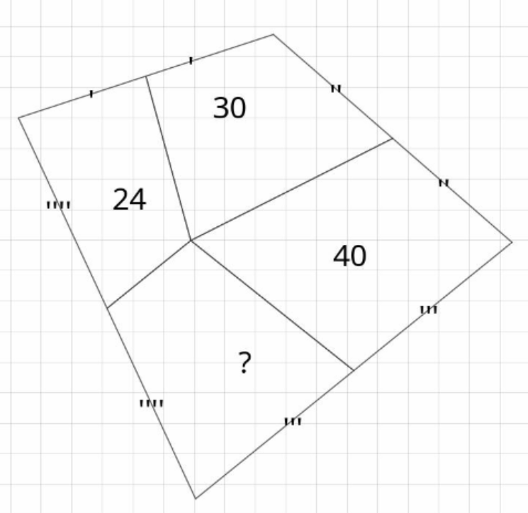 я помедитировал на тему - как геометрически получить положение точки внутри произвольного четырехугольника для разбиения его сабжевым образом на 4 в заданном соотношении площадей - и понял что достаточно в таком соотношении разбить соответствующие диагонали, итог определяет положение точки в задаваемой диагоналями косоугольной системе координат. в исходном случае эти ее координаты будут:  24/64 "слева направо" и 30/64 "сверху вниз". а равные площади - соответственно их серединки, 0.5 и 0.5