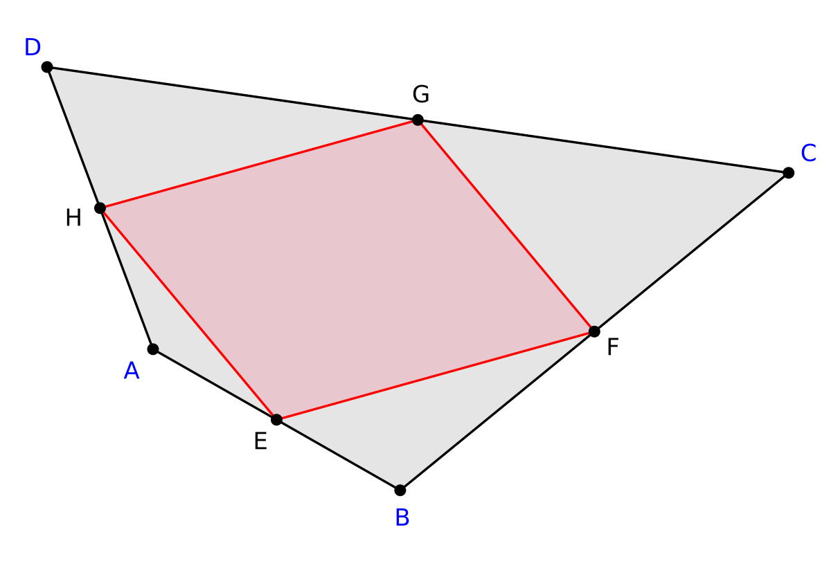 Цитата: cross-track от 30.03.2025 15:34:58Красная фигура - параллелограмм для любого четырехугольника, и ее площадь равна половине площади этого четырехугольника