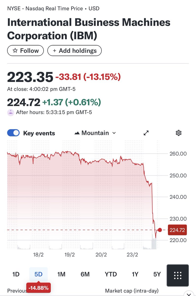 IBM dropped 13%. Worst single-day loss since October 2000. Twenty-five years of stock resilience ended by one AI company publishing a capability update.