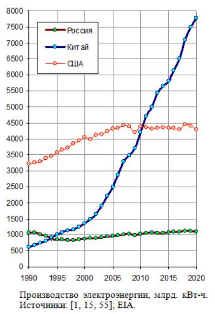 В США и России ппроизводство электроэнергии вышло на полочку (достигнуто равновесие между производством энергии и потребностями), а в Китае "отложенный" рост пока продолжается, и равновесие еще не достигнуто.
