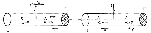 Цитировать...Давайте подумаем, что произойдет с отрицательным зарядом, движущимся со скоростью v0 параллельно проволоке, покоторой течет ток (фиг. 13.10). Постараемся разобраться в происходящем, используя две системы отсчета: одну, связанную с проволокой, как на фиг. 13.10, а, а другую — с частицей, как на фиг. 13.10, б. Мы будем называть первую систему отсчета S,  а  вторую S`.
