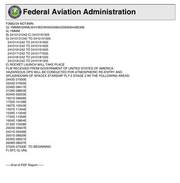 NSF спросил FAA, что означает свежий NOTMAR (см. вверху страницы). Ответили, что всё без изменений, 5-й полет ожидается не ранее конца ноября.