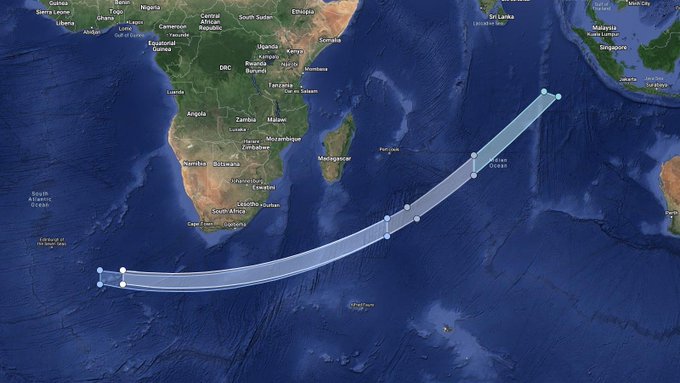 LHA map for #Starlink Group 6-64 from CCSFS SLC-40 NET 31 May 22:43 UTC, alternatively 01 to 04 Jun based on issued NOTAM/NOTMARs. Planned B1076.14 recovery 600km with estimated fairing recovery ~670km downrange. S2 debris reentry area in Indian Ocean. http://bit.ly/LHA-37