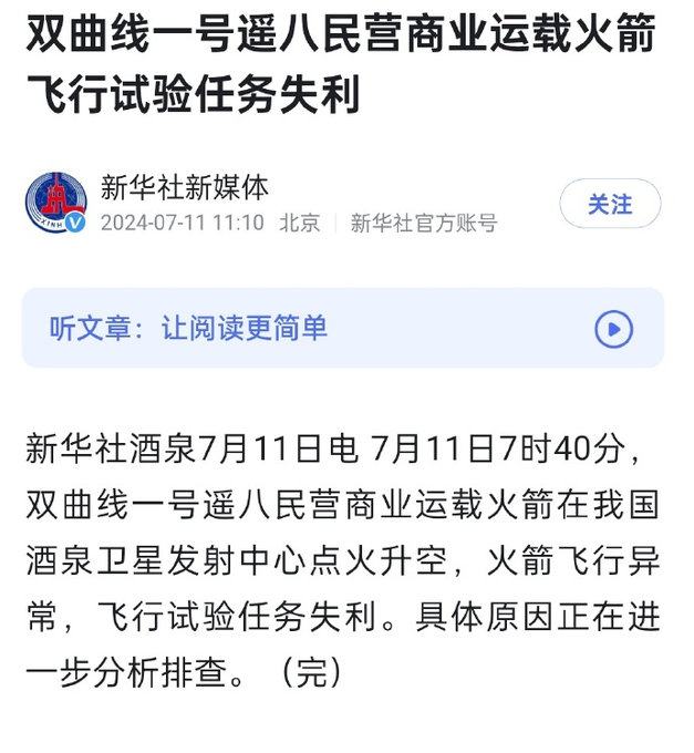 Цзюцюань, 11 июля /Синьхуа/ -- Коммерческая ракета-носитель SQX-1 Y8, принадлежащая китайской частной космической компании, в четверг провалила летные испытания.