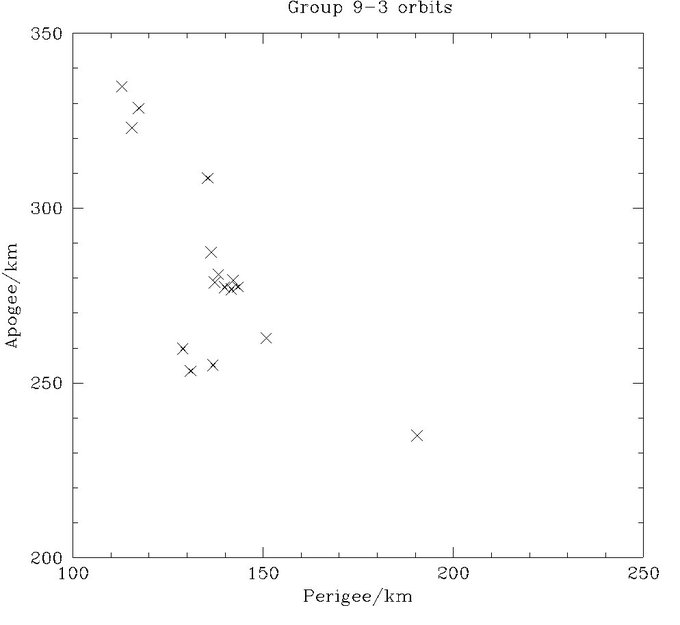 SupTLEs (orbital data from @CelesTrak  based on @SpaceX onboard Starlink ephemerides) shows the Group 9-3 satellites in orbits mostly around 130 x 280 km but some in only 115 x 322 km. One sat is in 190 x 235 km, possibly already orbit raising.
