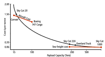 Low cost: at under $0.20 per ton/km, and given the vehicle's relatively high speed (155 kph), the SkyCat-220 becomes directly cost-competitive with trucks and other forms of overland freight.