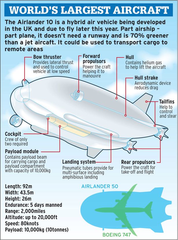 Airlander 10 может приземляться даже в неподготовленных для этого местах, вплоть до приземления на воду. Дирижабль наполнен гелием, его максимальная скорость составляет 150 км/ч.