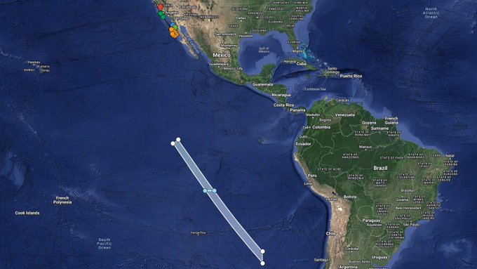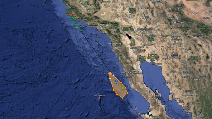 LHA map for #Starlink Group 9-4 from VSFB SLC-4E NET 28 Jul 07:24 UTC, alternatively 28 to 31 Jul based on issued NOTAM/NOTMARs. Estimated booster recovery ~627km with estimated fairing recovery ~703km downrange. Stage2 debris reentry in East Pacific. https://bit.ly/LHA-39