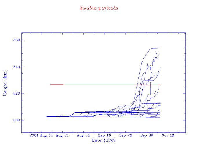 The payloads from the Qianfan (Chinese Starlink) launch have begun orbit raising  (red line is main fragment of rocket stage)
