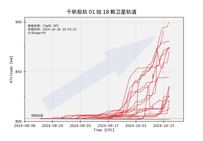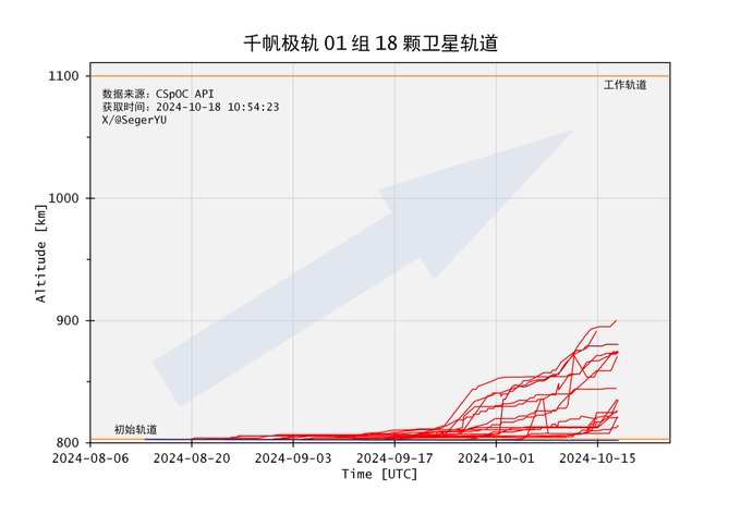 千帆极轨 01 组 18 颗卫星。抬轨进度最快的卫星,已经从初轨 800 km 抬升到了 900 km 高度;进度最慢的卫星,还没有开始变轨。