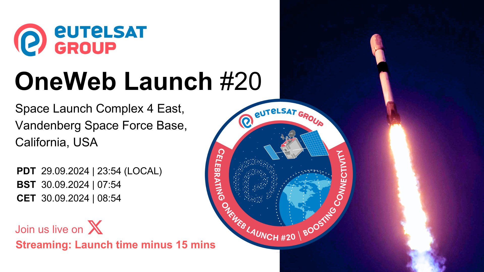 We are set to launch 20 OneWeb LEO satellites with @SpaceX no earlier than Sunday 29 September, from Vandenberg Space Force Base in California.