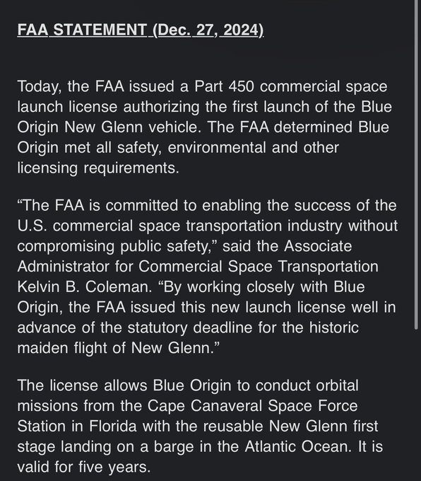 The FAA has approved the launch license for Blue Origin's New Glenn rocket! According to NOTAMs released today, launch is targeted for NET January 6th at 06:00 UTC, pending a successful static fire. For the 1st flight, New Glenn will carry the DarkSky-1 Blue Ring flight system.