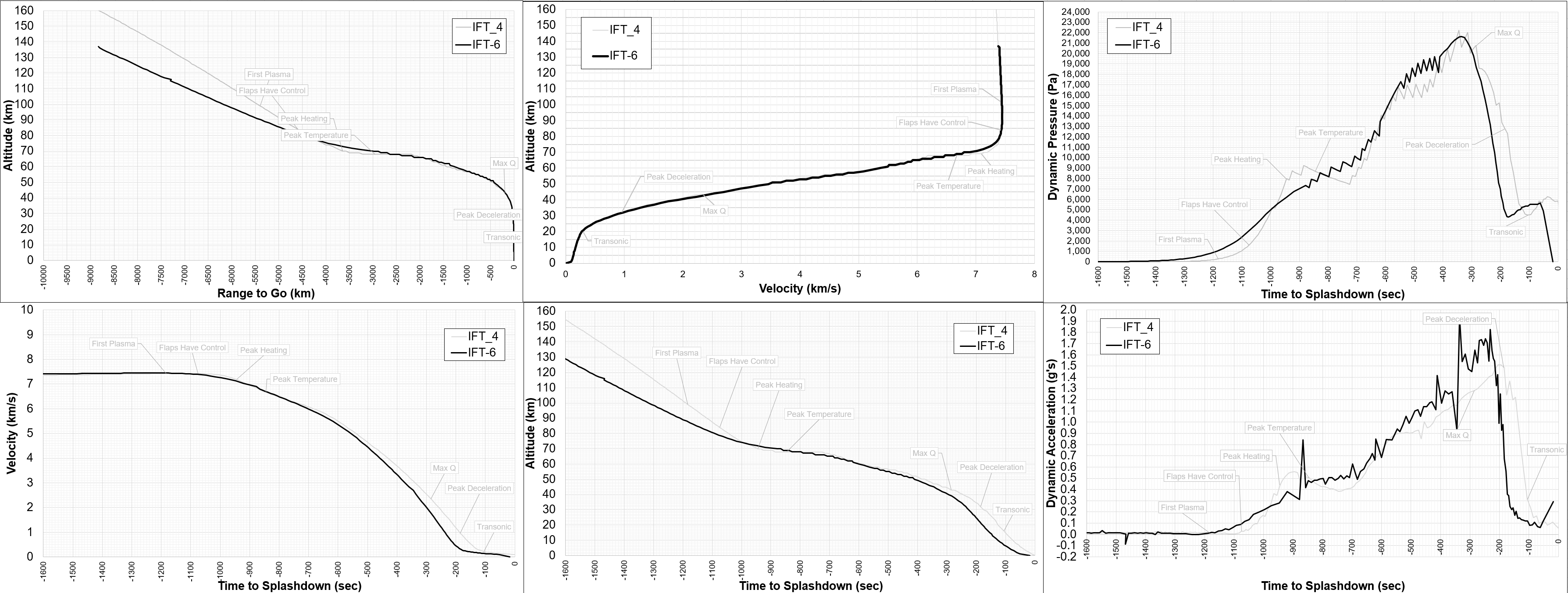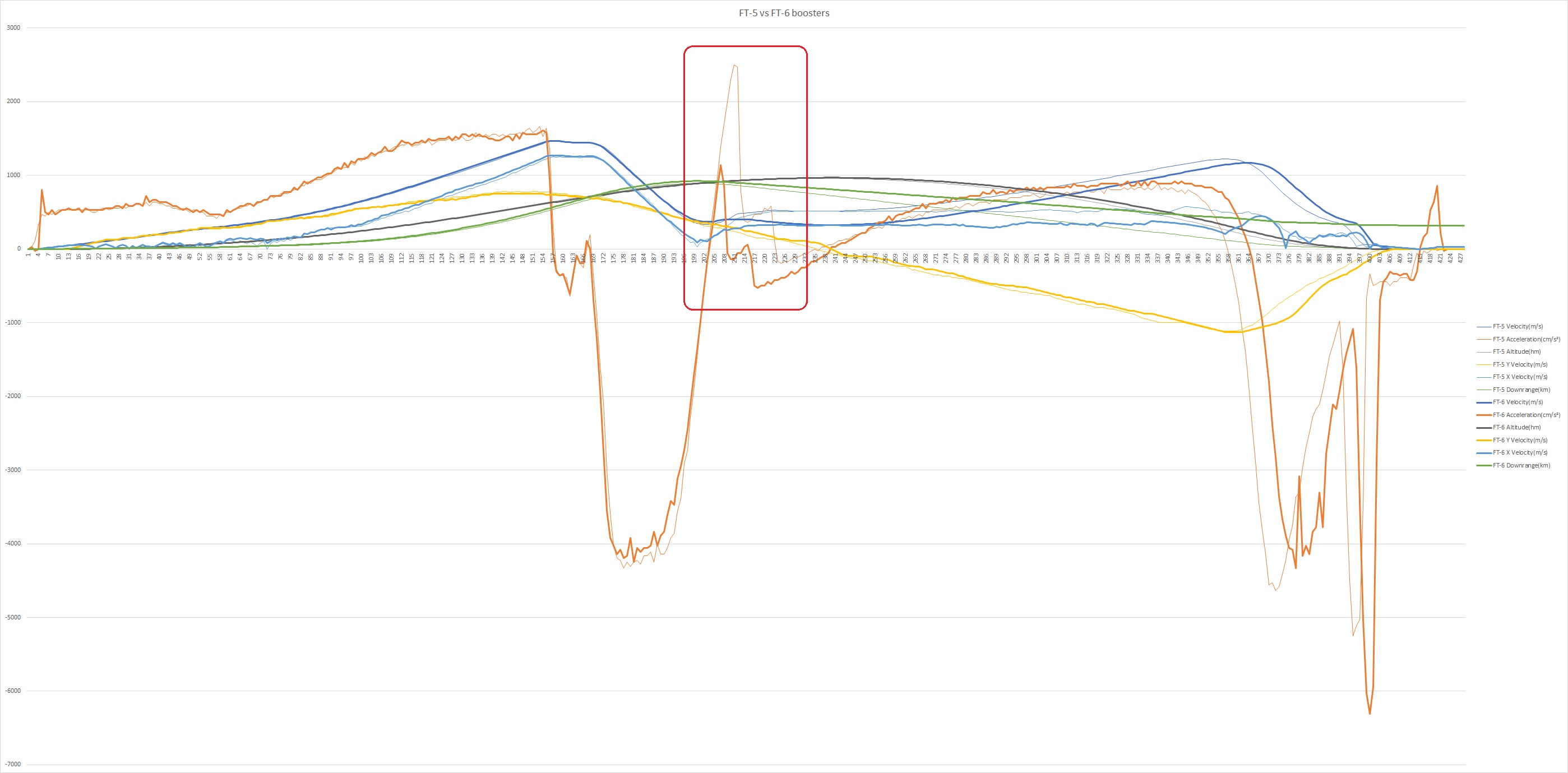 Жирная оранжевая линия - ускорение в IFT-6, тонкая оранжевая линия - ускорение в IFT-5. Автор этих графиков пишет на NSF, что в 6-м полете бустбэк был сокращен примерно на 6 секунд, что сместило точку возвращения бустера примерно на 30 км к востоку от берега. То есть к этому моменту уже было решено садиться в море. Отсюда.