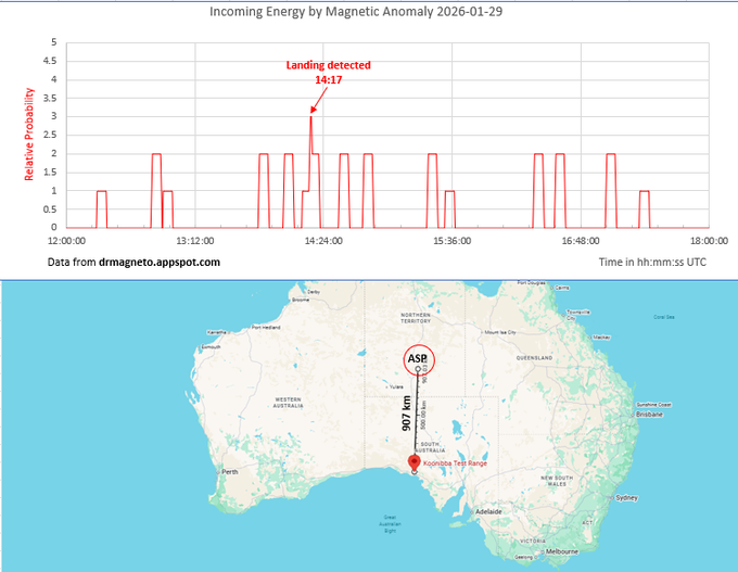 The @VardaSpace W-5 spacecraft landed at Koonibba Test Range on Jan 29. They haven't released the landing time yet, but the TLEs show a pass over Koonibba at 1353 UTC so I guess landing was close to 1400 UTC