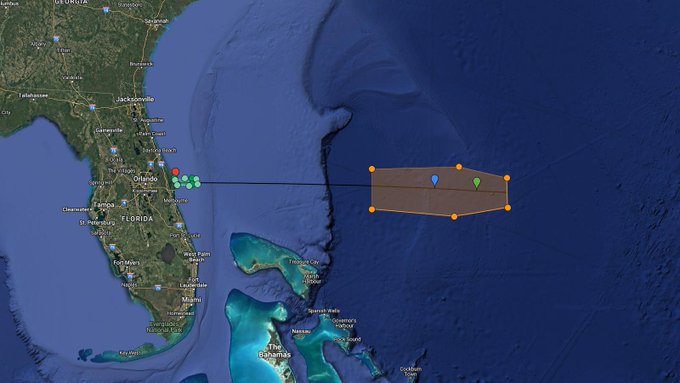 Launch Hazard Areas map for #Sirius XM-9 mission from KSC LC-39A valid for NET 05 Dec 16:10 UTC, alternatively 06 to 09 Dec based on issued NOTAM/NOTMARs. Estimated B1076.19 recovery 655km with estimated fairing recovery ~762km downrange. http://bit.ly/LHA-44