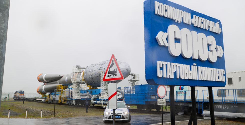Сегодня ракета космического назначения «Союз-2.1б» с гелиогеофизическими космическими аппаратами «Ионосфера-М» № 3 и № 4 и 18 малыми космическими аппаратами была транспортирована на стартовый комплекс площадки 1С космодрома Восточный.