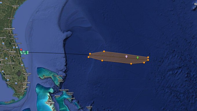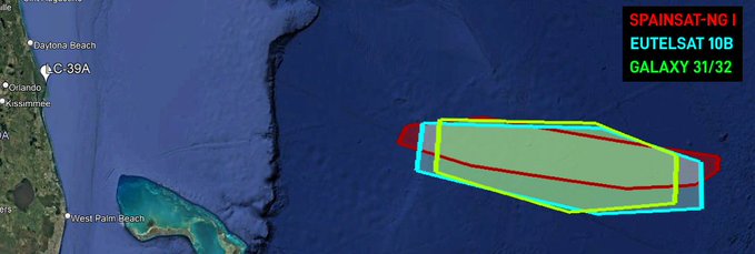 Launch Hazard Areas for #SpainSat NGI mission from KSC LC-39A, valid for NET 30 Jan 01:34 UTC, altern. 31 Jan to 04 Feb based on issued NOTMAR/NOTAM. Expendable flight for B1073.21. Estimated fairing recovery position approx. 1022km downrange. https://bit.ly/LHA-47