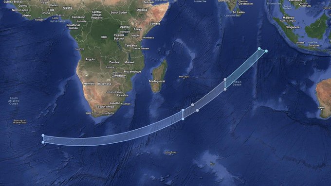 LHA map for #Starlink Group 12-12 from CCSFS SLC-40 NET 10 Jan 15:27 UTC, alternatively 11 to 15 Jan based on issued NOTAM/NOTMARs. Planned booster recovery 600km with estimated fairing recovery ~670km downrange. S2 debris reentry area in Indian Ocean. http://bit.ly/LHA-46