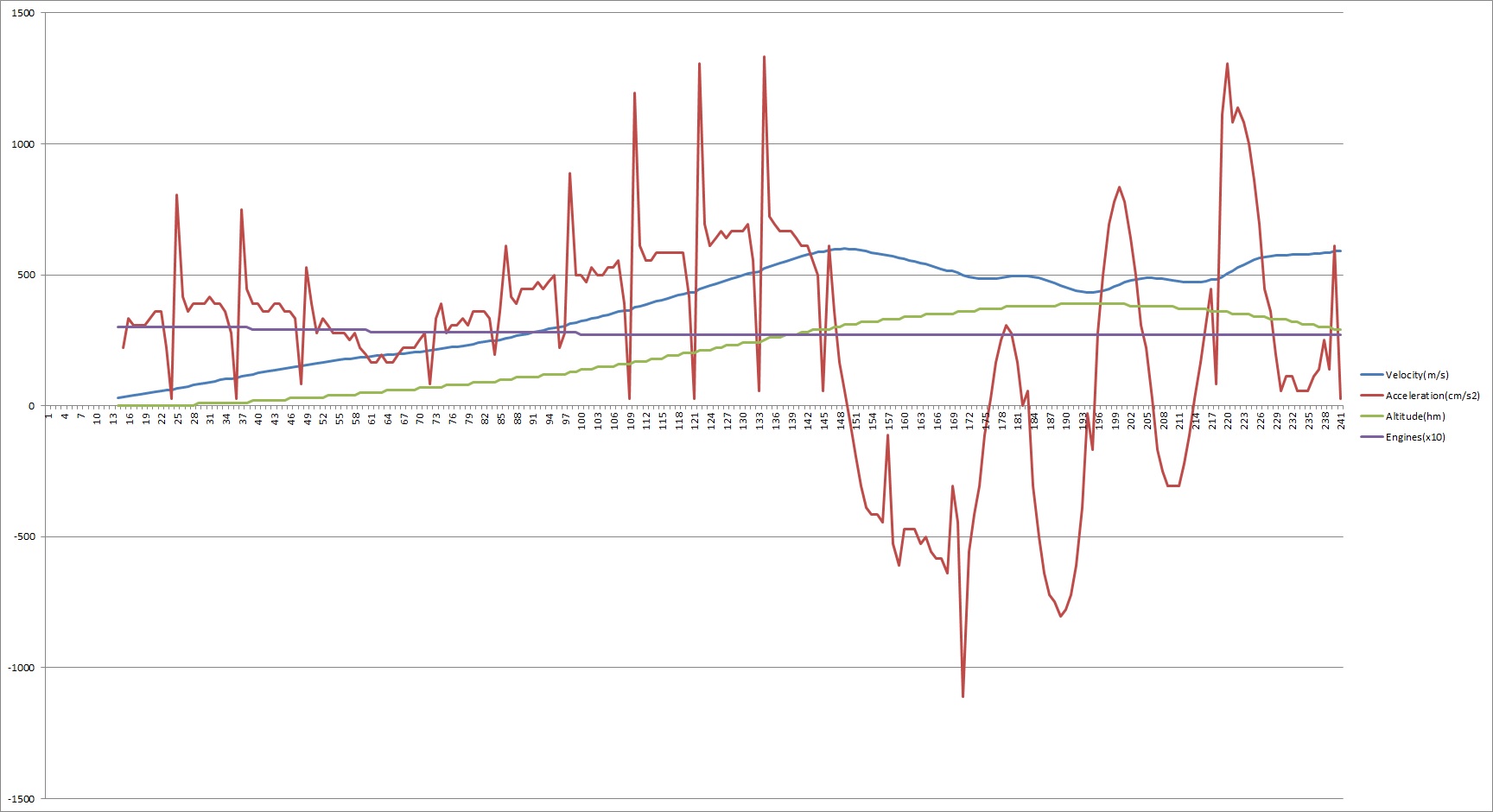 А, это первый полет (график для бустера), понятно. Максимальная скорость не более 700 м/с, максимальная высота не более 40 км?