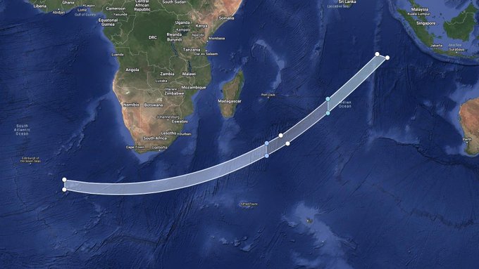 LHA map for #Starlink Group 12-9 from CCSFS SLC-40 NET 07 Feb 18:52 UTC, alternatively 08 to 13 Feb based on issued NOTAM/NOTMARs. Planned B1078.17 recovery 600km with estimated fairing recovery ~670km downrange. S2 debris reentry area in Indian Ocean. http://bit.ly/LHA-47