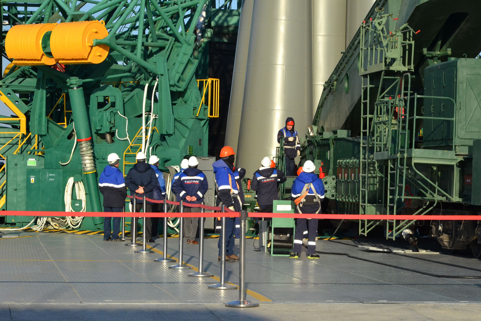 В соответствии с графиком первого стартового дня пусковые расчёты приступили к выполнению технологических операций по стыковке коммуникаций ракеты с наземным оборудованием для проведения автономных испытаний систем и агрегатов корабля, носителя и стартового комплекса.