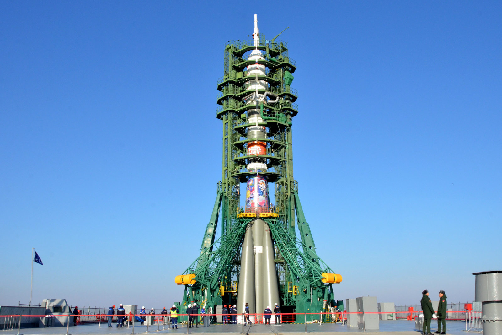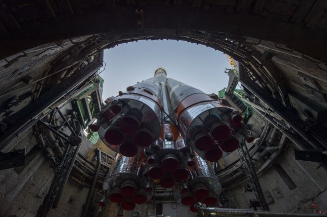Весь масштаб ракеты-носителя с пилотируемым кораблём «Союз МС-28» с высоты птичьего полёта.