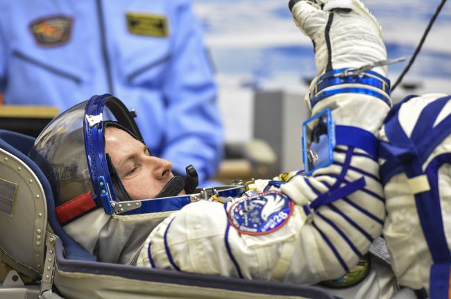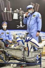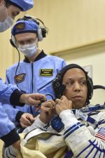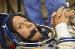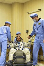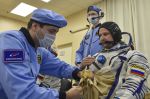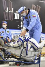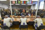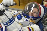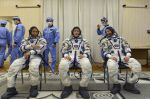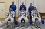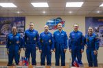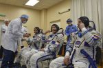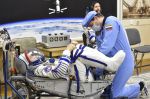 В монтажно-испытательном комплексе космонавты и астронавт надели скафандры и проверили их на герметичность.