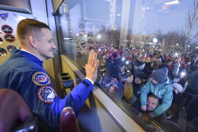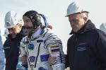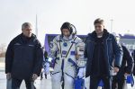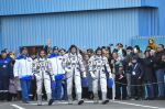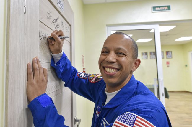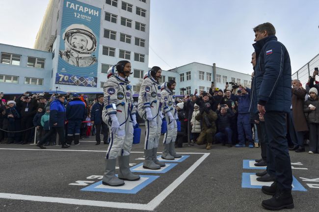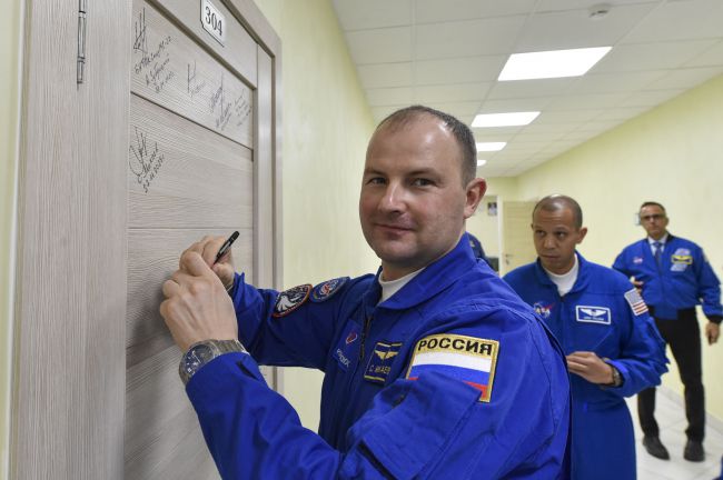 На Байконуре чтут «предстартовые» традиции. Экипаж покинул гостиницу под негласный гимн космонавтов – знаменитую композицию «Трава у дома», предварительно оставив автографы на дверях гостиницы «Космонавт».