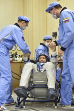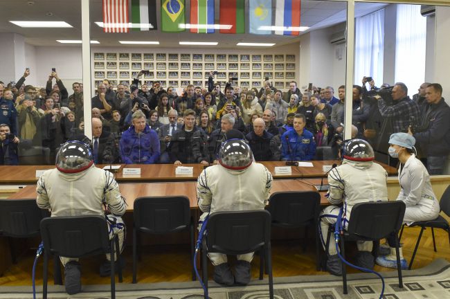 После доклада Государственной комиссии о готовности к полёту члены экипажа заняли свои места в корабле «Союз МС-28».