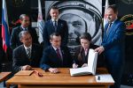Пётр Валерьевич ДУБРОВ (на фото в центре) – Герой Российской Федерации, лётчик-космонавт РФ, командир ТПК «Союз МС», бортинженер МКС, Роскосмос (Россия).