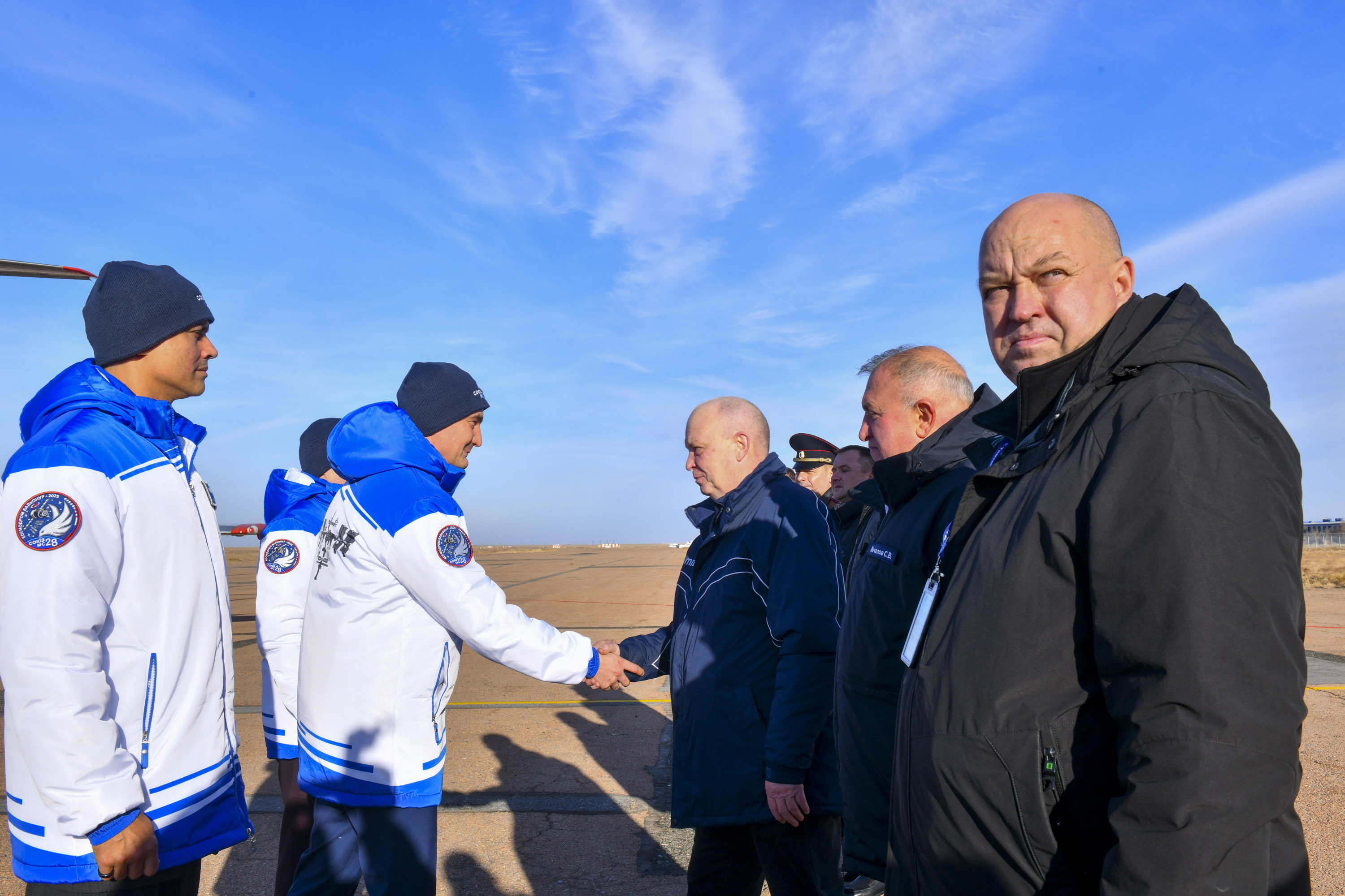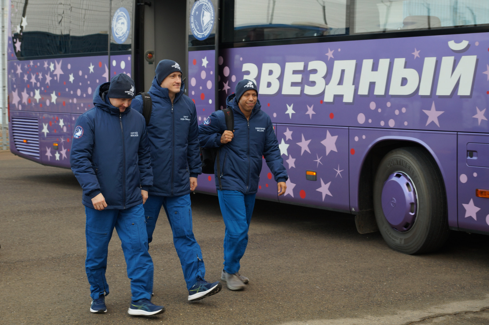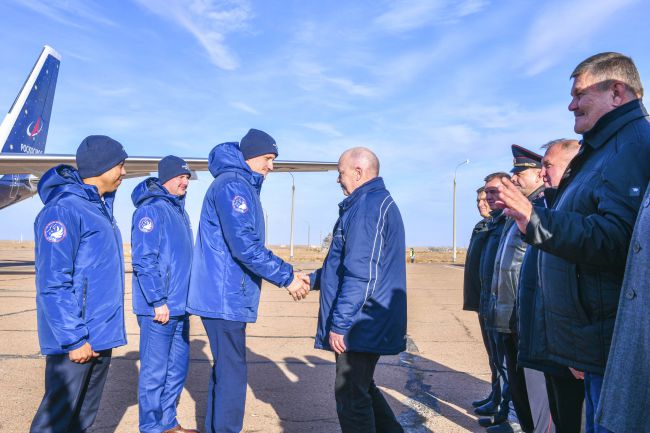 11 ноября 2025 года, после торжественных проводов экипажей 74-й длительной экспедиции на МКС в Звёздном городке, космонавты и астронавты отправились на подмосковный аэродром Чкаловский, откуда двумя спецбортами вылетели в Казахстан для прохождения завершающего этапа предстартовой подготовки. Через несколько часов самолёты благополучно приземлились на аэродроме Крайний неподалёку от г. Байконура.