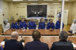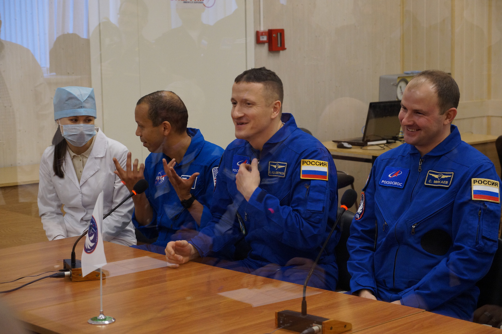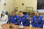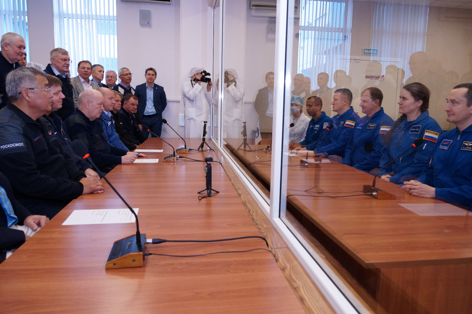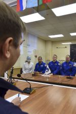 Перед отправлением на аэродром Сергей Кудь-Сверчков, Сергей Микаев и Кристофер Уилльямс ответили на вопросы журналистов. Члены экипажа рассказали о запланированной работе во время выполнения космического полета, научной программе и взаимодействии внутри коллектива.