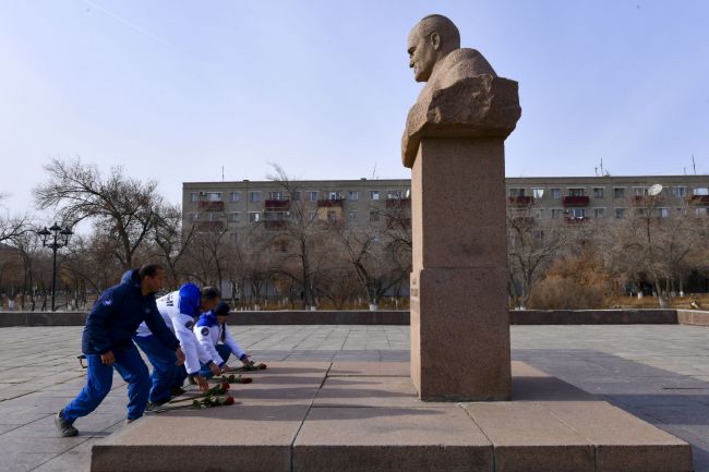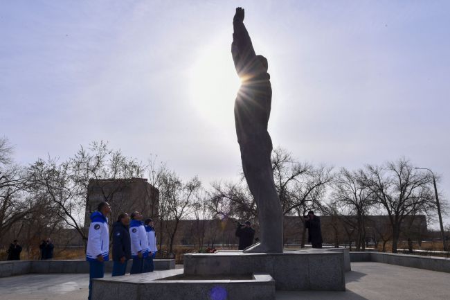 После церемонии поднятия флагов космонавты-дублёры отправились на экскурсию по Байконуру, история которого неразрывно связана с именами великих людей, участвующих в освоении космоса. Экипаж возложил цветы к памятнику первому космонавту планеты Ю.А. Гагарину и легендарному конструктору С.П. Королёву.