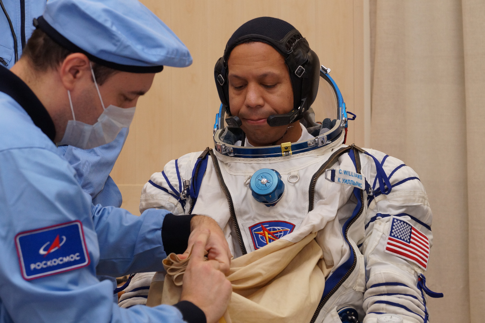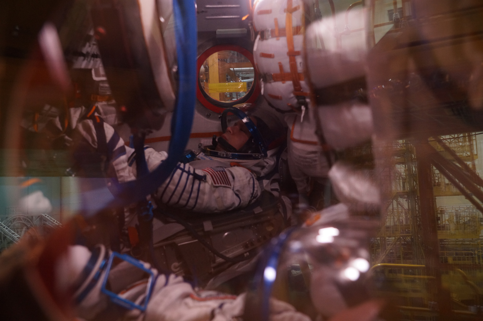 Важная часть первой примерки корабля заключается в работе основного экипажа в скафандрах. Космонавты Сергей Кудь-Сверчков, Сергей Микаев и астронавт Кристофер Уилльямс надели их и проверили на герметичность на специальном стенде, а затем перешли уже в скафандрах в корабль и продолжили там работу. Им было важно убедиться, насколько удобно в них сидеть в ложементах, удобно ли они расположены относительно пульта управления.