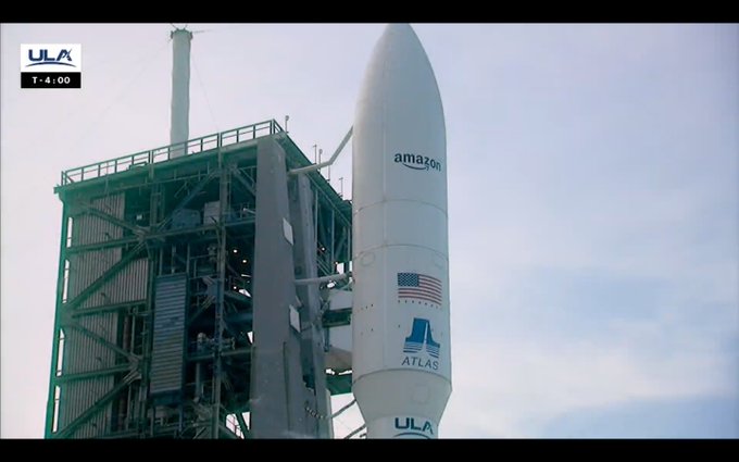 We are just 10 minutes away from #ProjectKuiper taking flight on the shoulders of #AtlasV. This is ULA's first of 46 launches on behalf of #Amazon to deploy a majority of the #ProjectKuiper broadband satellite constellation in low Earth orbit.