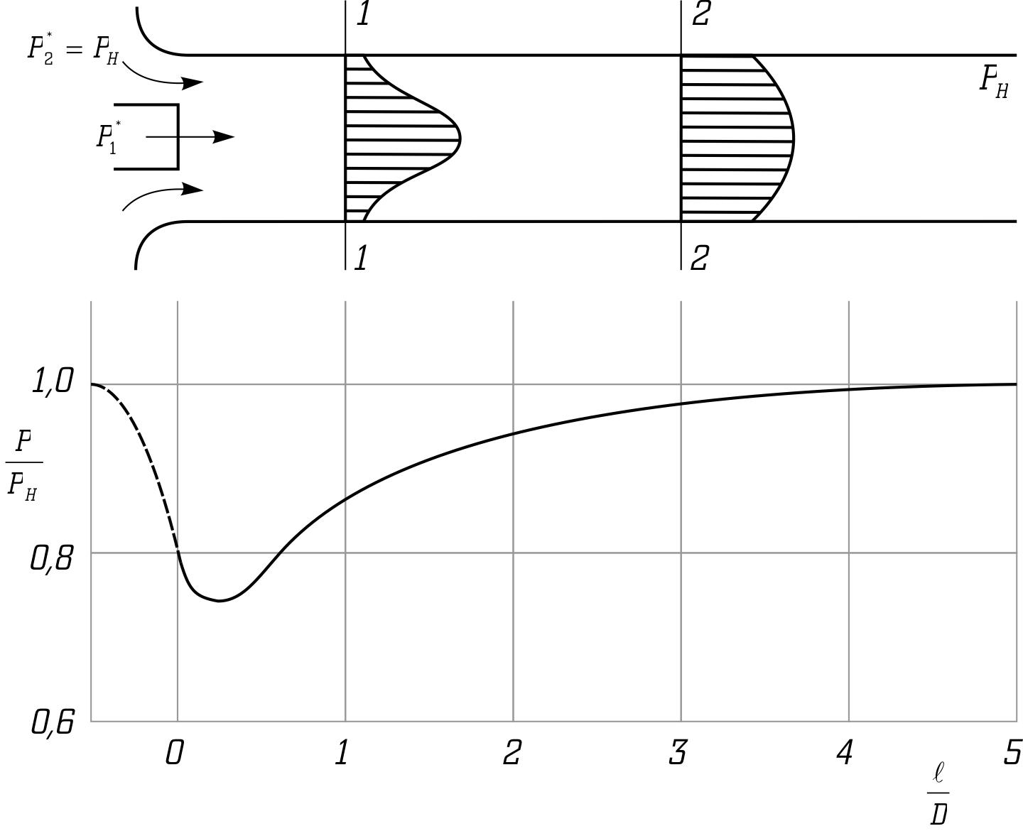 На графике приведена кривая, соответствующая отношению статических давлений. В знаменателе стоит Рн, т.е. атмосферное давление. Другими словами, на внешнем входе в эжектор и на выходе из эжектора давление одинаковое, и оно равно атмосферному. Но на графике есть пунктирная линия, которая начинается от среза сопла и доходит влево до отношения давлений=1, но это значение относится именно к внешнему входу в эжектор, т.е. до смешения с потоком из сопла. А вот сразу после сопла статическое давление будет не 1, а 0.8, в полном согласии с Бернулли.