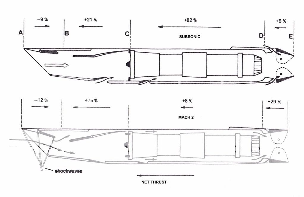 В ГТД тягу создают ВСЕ элементы газовоздушного тракта. Разница лишь в пропорциях и знаке. Тяга создаваемая соплом также зависит от скорости полета. До ГТД формула тяги F = G * (Vi - Vp), где G-массовый расход, Vi-скорость истечения на срезе сопла, Vp- скорость полета. Отсюда видно, что с ростом скорости полета тяга падает при прочих равных. Таким образом не удивительно, что с ростом скорости происходит падение ДОЛИ одних элементов и увеличение ДОЛИ других в общей сумме тяги. И обратите внимание на подсос воздуха через открытие/закрытие разных шторок/каналов. На дозвуке это даёт 6%(сечение D-E)А на сверхзвуке 29%