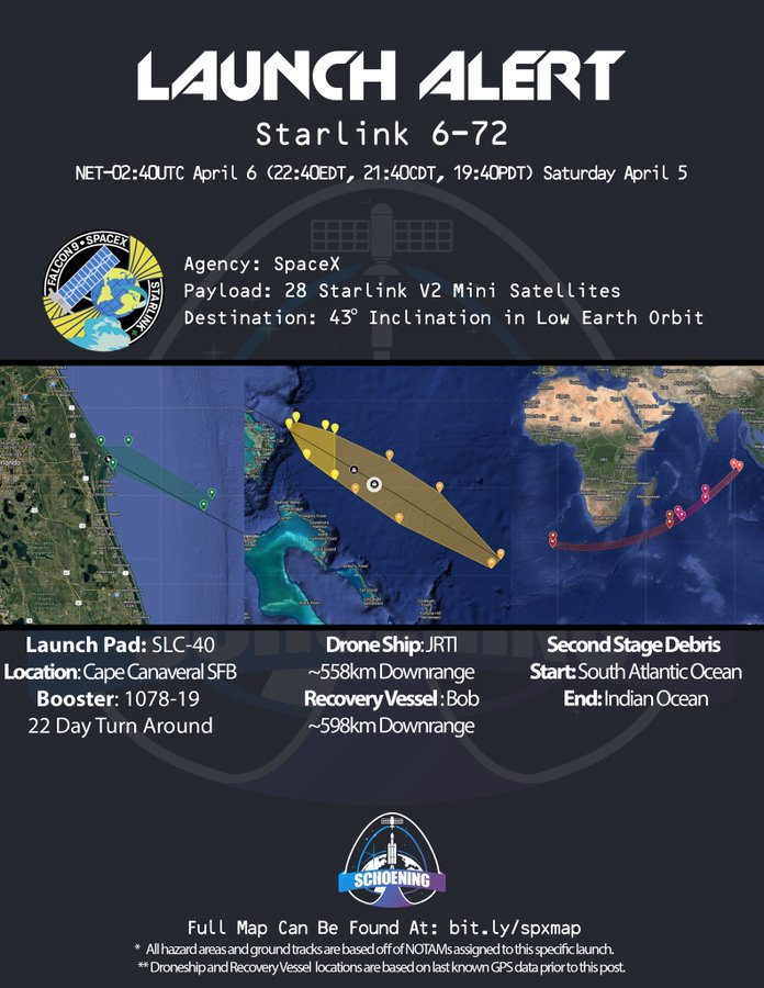 Recovery crews aboard Just Read the Instructions, and Bob are making their way to the hazard areas for Stage 1 re-entry for tomorrow's scheduled Starlink Group 6-72 launch. Current launch is NET: 02:40UTC April 6th (22:40 EDT, 21:40 CDT, and 19:40PDT April 5th)