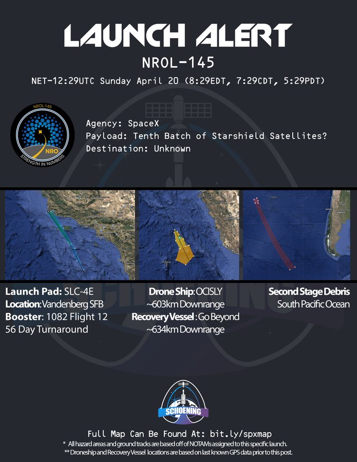 LAUNCH UPDATE: NROL-145 is scheduled to launch on a @SpaceX Falcon 9 rocket from Vandenberg Space Force Base NET April 20.