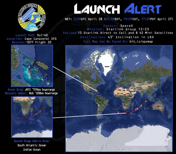 ЦитироватьSpaceX is targeting Sunday, April 27 for a Falcon 9 launch of 23 Starlink satellites, including 13 with Direct to Cell capabilities, to low-Earth orbit from Space Launch Complex 40 (SLC-40) at Cape Canaveral Space Force Station in Florida. Liftoff is targeted for 10:09 p.m. ET, with backup opportunities available until 1:49 a.m. ET on Monday, April 28. If needed, additional launch opportunities are also available on Monday, April 28 starting at 9:51 p.m. ET...