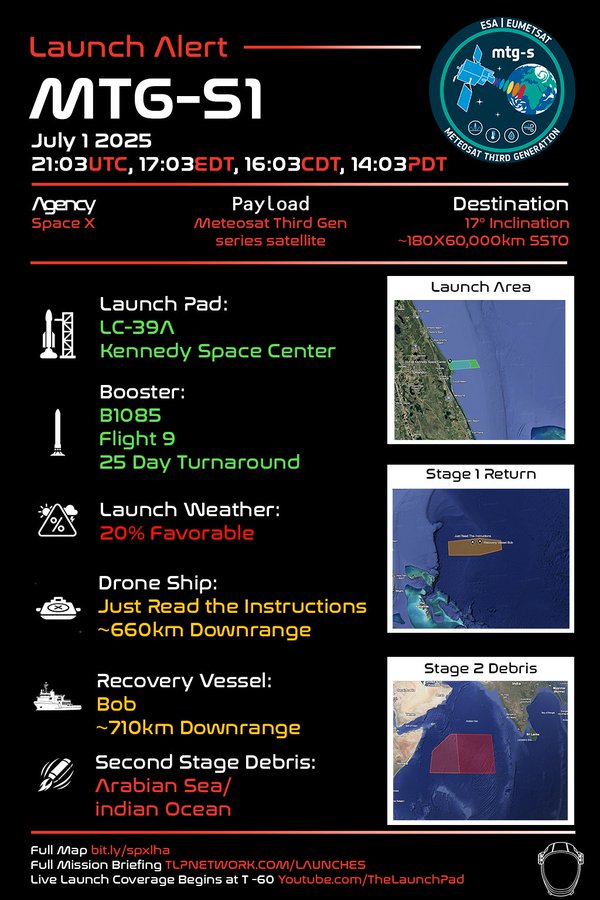 ЦитироватьSpaceX is targeting Tuesday, July 1 for a Falcon 9 launch of the Eumetsat MTG-S1 mission to geosynchronous transfer orbit from Launch Complex 39A (LC-39A) at Kennedy Space Center in Florida. The 150-minute window opens at 5:04 p.m. ET. If needed, a backup launch opportunity is available on Wednesday, July 2 at the same time.